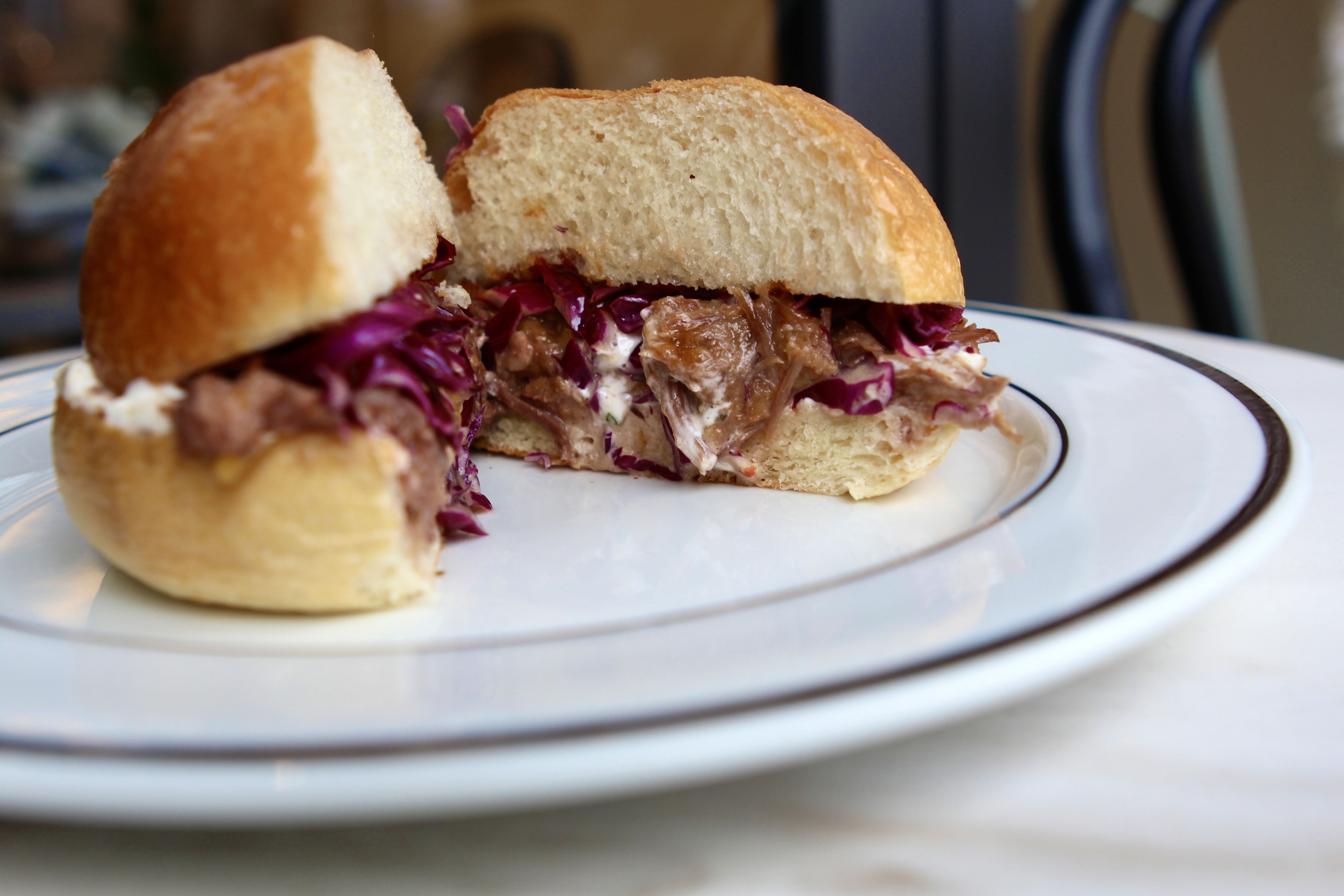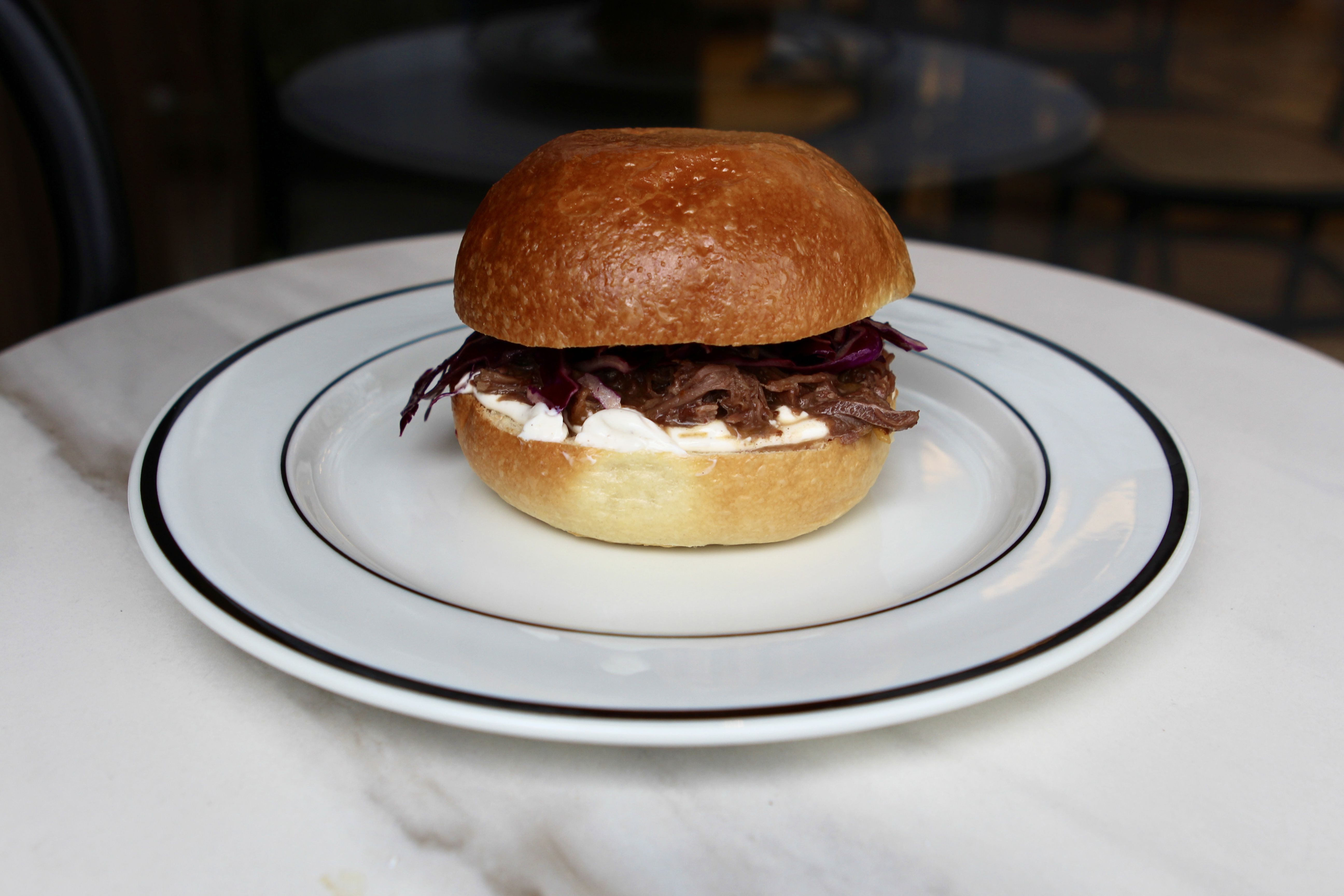 Описание: Брьош с дърпано телешко, чедър и ранч барбекю сос.
